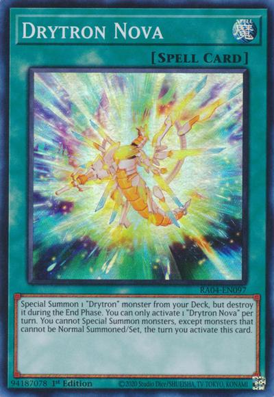Special Summon 1 ‘Drytron’ monster from your Deck, but destroy it during the End Phase. You can only activate 1 ‘Drytron Nova’ per turn. You cannot Special Summon monsters, except monsters that cannot be Normal Summoned/Set, the turn you activate this card.