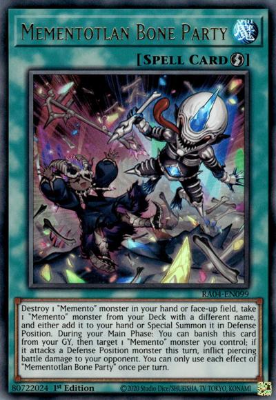 Destroy 1 ‘Memento’ monster in your hand or face-up field, take 1 ‘Memento’ monster from your Deck with a different name, and either add it to your hand or Special Summon it in Defense Position. During your Main Phase: You can banish this card from your GY, then target 1 ‘Memento’ monster you control; if it attacks a Defense Position monster this turn, inflict piercing battle damage to your opponent. You can only use each effect of ‘Mementotlan Bone Party’ once per turn.