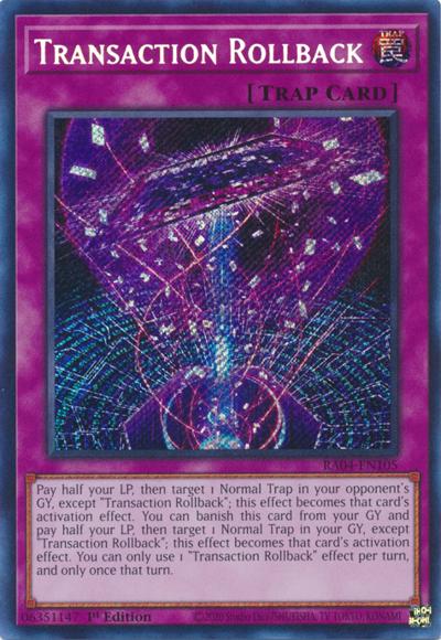 Pay half your LP, then target 1 Normal Trap in your opponent’s GY, except ‘Transaction Rollback’; this effect becomes that card’s activation effect. You can banish this card from your GY and pay half your LP, then target 1 Normal Trap in your GY, except ‘Transaction Rollback’; this effect becomes that card’s activation effect. You can only use 1 ‘Transaction Rollback’ effect per turn, and only once that turn.