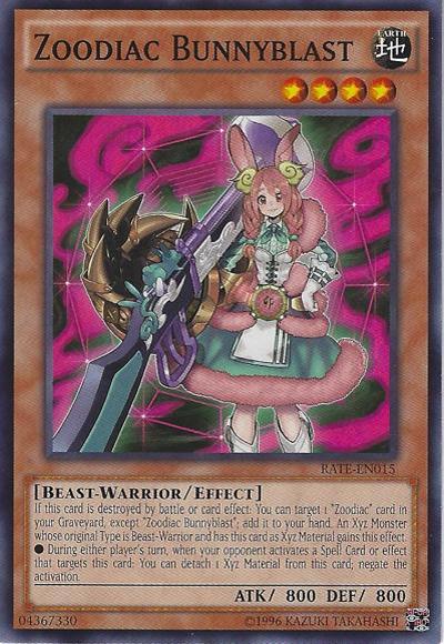 If this card is destroyed by battle or card effect: You can target 1 ‘Zoodiac’ card in your Graveyard, except ‘Zoodiac Bunnyblast’; add it to your hand. An Xyz Monster whose original Type is Beast-Warrior and has this card as Xyz Material gains this effect.● During either player’s turn, when your opponent activates a Spell Card or effect that targets this card: You can detach 1 Xyz Material from this card; negate the activation.