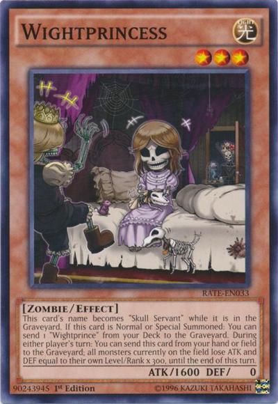 This card’s name becomes ‘Skull Servant’ while it is in the Graveyard. If this card is Normal or Special Summoned: You can send 1 ‘Wightprince’ from your Deck to the Graveyard. During either player’s turn: You can send this card from your hand or field to the Graveyard; all monsters currently on the field lose ATK and DEF equal to their own Level/Rank x 300, until the end of this turn.