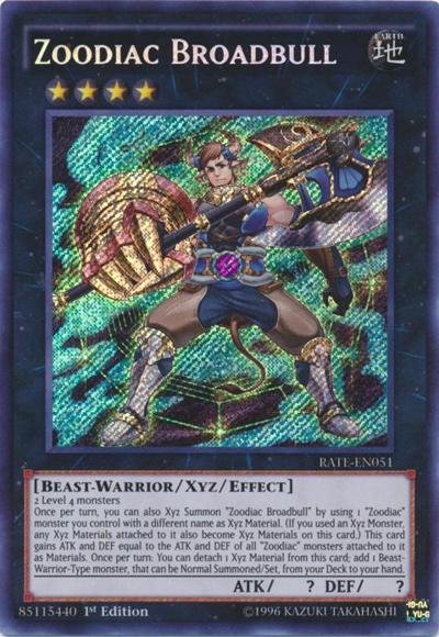 2 Level 4 monstersOnce per turn, you can also Xyz Summon ‘Zoodiac Broadbull’ by using 1 ‘Zoodiac’ monster you control with a different name as Xyz Material. (If you used an Xyz Monster, any Xyz Materials attached to it also become Xyz Materials on this card.) This card gains ATK and DEF equal to the ATK and DEF of all ‘Zoodiac’ monsters attached to it as Materials. Once per turn: You can detach 1 Xyz Material from this card; add 1 Beast-Warrior-Type monster, that can be Normal Summoned/Set, from your Deck to your hand.