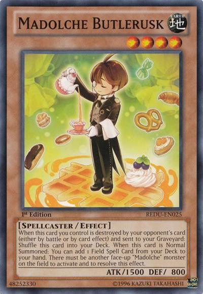 When this card you control is destroyed by your opponent’s card (either by battle or by card effect) and sent to your Graveyard: Shuffle this card into your Deck. When this card is Normal Summoned: You can add 1 Field Spell Card from your Deck to your hand. There must be another face-up ‘Madolche’ monster on the field to activate and to resolve this effect.