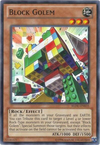 If all the monsters in your Graveyard are EARTH: You can Tribute this card to target 2 Level 4 or lower Rock-Type monsters in your Graveyard, except ‘Block Golem’; Special Summon those targets, but their effects that activate on the field cannot be activated this turn.
