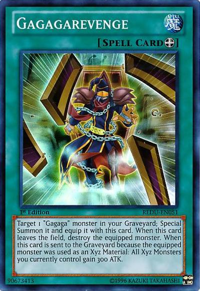 Target 1 ‘Gagaga’ monster in your Graveyard; Special Summon it and equip it with this card. When this card leaves the field, destroy the equipped monster. When this card is sent to the Graveyard because the equipped monster was used as an Xyz Material: All Xyz Monsters you currently control gain 300 ATK.