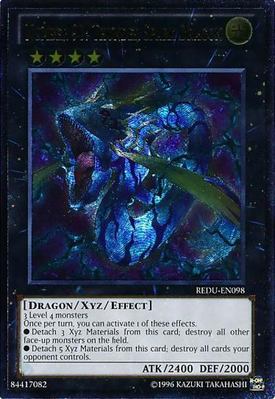 3 Level 4 monstersOnce per turn, you can activate 1 of these effects.● Detach 3 Xyz Materials from this card; destroy all other face-up monsters on the field.● Detach 5 Xyz Materials from this card; destroy all cards your opponent controls.
