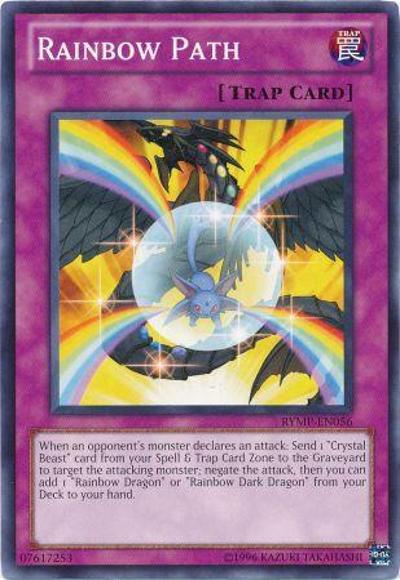 When an opponent’s monster declares an attack: Send 1 ‘Crystal Beast’ card from your Spell & Trap Card Zone to the Graveyard to target the attacking monster; negate the attack, then you can add 1 ‘Rainbow Dragon’ or ‘Rainbow Dark Dragon’ from your Deck to your hand.