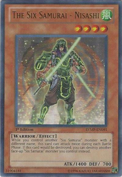 While you control a face-up ‘Six Samurai’ monster with a different name, this card can attack twice during each Battle Phase. If this card would be destroyed, you can destroy another face-up ‘Six Samurai’ monster you control instead.