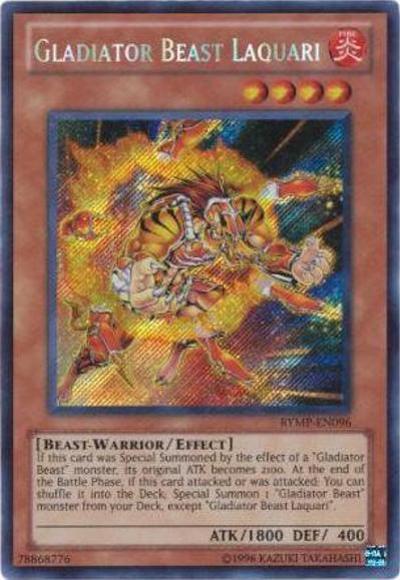 If this card was Special Summoned by the effect of a ‘Gladiator Beast’ monster, its original ATK becomes 2100. At the end of the Battle Phase, if this card attacked or was attacked: You can shuffle it into the Deck; Special Summon 1 ‘Gladiator Beast’ monster from your Deck, except ‘Gladiator Beast Laquari’.