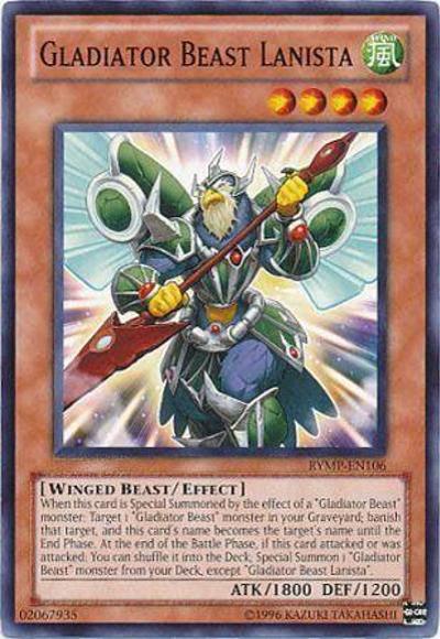 When this card is Special Summoned by the effect of a ‘Gladiator Beast’ monster: Target 1 ‘Gladiator Beast’ monster in your Graveyard; banish that target, and this card’s name becomes the target’s name until the End Phase. At the end of the Battle Phase, if this card attacked or was attacked: You can shuffle it into the Deck; Special Summon 1 ‘Gladiator Beast’ monster from your Deck, except ‘Gladiator Beast Lanista’.