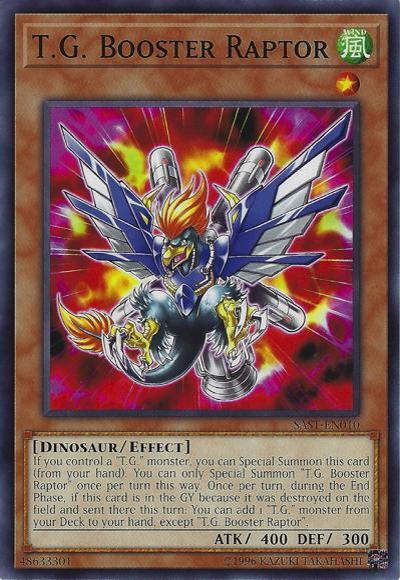 If you control a ‘T.G.’ monster, you can Special Summon this card (from your hand). You can only Special Summon ‘T.G. Booster Raptor’ once per turn this way. Once per turn, during the End Phase, if this card is in the GY because it was destroyed on the field and sent there this turn: You can add 1 ‘T.G.’ monster from your Deck to your hand, except ‘T.G. Booster Raptor’.