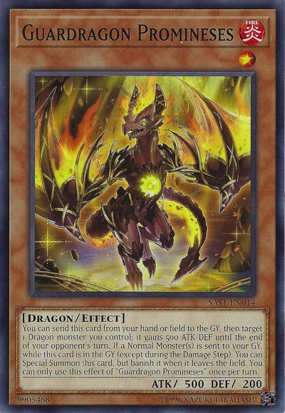 You can send this card from your hand or field to the GY, then target 1 Dragon monster you control; it gains 500 ATK/DEF until the end of your opponent’s turn. If a Normal Monster(s) is sent to your GY, while this card is in the GY (except during the Damage Step): You can Special Summon this card, but banish it when it leaves the field. You can only use this effect of ‘Guardragon Promineses’ once per turn.