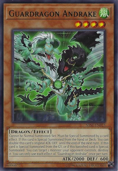 Cannot be Normal Summoned/Set. Must be Special Summoned by a card effect. If this card is Special Summoned from the hand or Deck: You can double this card’s original ATK/DEF, until the end of the next turn. If this card is Special Summoned from the GY, or if this banished card is Special Summoned: You can target 1 monster your opponent controls; destroy it. You can only use each effect of ‘Guardragon Andrake’ once per turn.