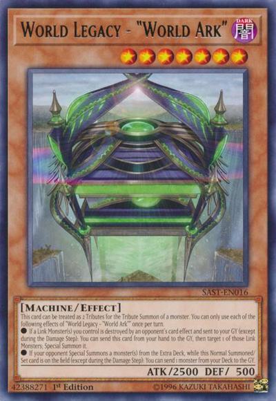 This card can be treated as 2 Tributes for the Tribute Summon of a monster. You can only use each of the following effects of ‘World Legacy – ‘World Ark” once per turn.● If a Link Monster(s) you control is destroyed by an opponent’s card effect and sent to your GY (except during the Damage Step): You can send this card from your hand to the GY, then target 1 of those Link Monsters; Special Summon it.● If your opponent Special Summons a monster(s) from the Extra Deck, while this Normal Summoned/Set card is on the field (except during the Damage Step): You can send 1 monster from your Deck to the GY.