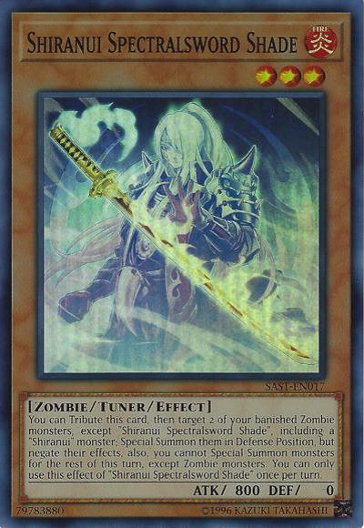 You can Tribute this card, then target 2 of your banished Zombie monsters, except ‘Shiranui Spectralsword Shade’, including a ‘Shiranui’ monster; Special Summon them in Defense Position, but negate their effects, also, you cannot Special Summon monsters for the rest of this turn, except Zombie monsters. You can only use this effect of ‘Shiranui Spectralsword Shade’ once per turn.