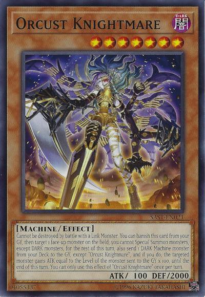 Cannot be destroyed by battle with a Link Monster. You can banish this card from your GY, then target 1 face-up monster on the field; you cannot Special Summon monsters, except DARK monsters, for the rest of this turn, also send 1 DARK Machine monster from your Deck to the GY, except ‘Orcust Knightmare’, and if you do, the targeted monster gains ATK equal to the Level of the monster sent to the GY x 100, until the end of this turn. You can only use this effect of ‘Orcust Knightmare’ once per turn.
