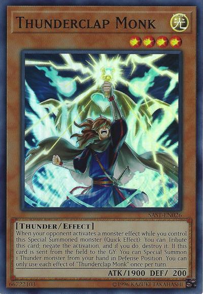 When your opponent activates a monster effect while you control this Special Summoned monster (Quick Effect): You can Tribute this card; negate the activation, and if you do, destroy it. If this card is sent from the field to the GY: You can Special Summon 1 Thunder monster from your hand in Defense Position. You can only use each effect of ‘Thunderclap Monk’ once per turn.