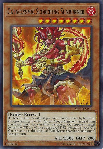 If a face-up FIRE monster(s) you control is destroyed by battle or an opponent’s card effect: You can Special Summon this card from your hand, then, you can inflict damage to your opponent equal to half the ATK of 1 of those destroyed FIRE monsters in your GY. You can only use this effect of ‘Cataclysmic Scorching Sunburner’ once per turn.