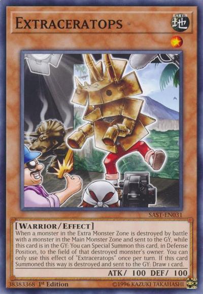 When a monster in the Extra Monster Zone is destroyed by battle with a monster in the Main Monster Zone and sent to the GY, while this card is in the GY: You can Special Summon this card, in Defense Position, to the field of that destroyed monster’s owner. You can only use this effect of ‘Extraceratops’ once per turn. If this card Summoned this way is destroyed and sent to the GY: Draw 1 card.