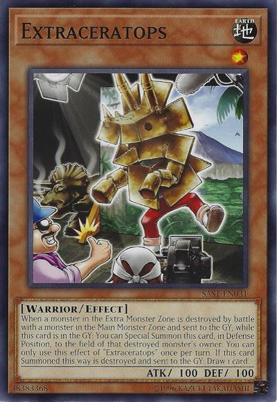 When a monster in the Extra Monster Zone is destroyed by battle with a monster in the Main Monster Zone and sent to the GY, while this card is in the GY: You can Special Summon this card, in Defense Position, to the field of that destroyed monster’s owner. You can only use this effect of ‘Extraceratops’ once per turn. If this card Summoned this way is destroyed and sent to the GY: Draw 1 card.