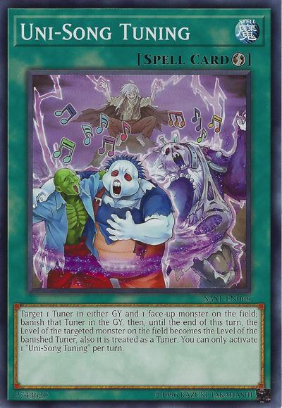 Target 1 Tuner in either GY and 1 face-up monster on the field; banish that Tuner in the GY, then, until the end of this turn, the Level of the targeted monster on the field becomes the Level of the banished Tuner, also it is treated as a Tuner. You can only activate 1 ‘Uni-Song Tuning’ per turn.