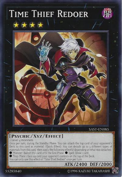 2 Level 4 monstersOnce per turn, during the Standby Phase: You can attach the top card of your opponent’s Deck to this card as material. (Quick Effect): You can detach up to 3 different types of materials from this card, then apply the following effect(s) depending on what was detached.● Monster: Banish this card until the End Phase. ● Spell: Draw 1 card.● Trap: Place 1 face-up card your opponent controls on the top of the Deck.You can only use this effect of ‘Time Thief Redoer’ once per turn.