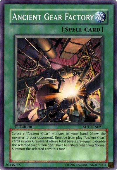 Reveal 1 Level 5 or higher ‘Ancient Gear’ monster from your hand, then banish a number of ‘Ancient Gear’ monsters from your Graveyard, whose combined Levels are double the revealed monster’s, and if you do, if you Normal Summon the revealed monster this turn, you must Normal Smmon it without Tributing.