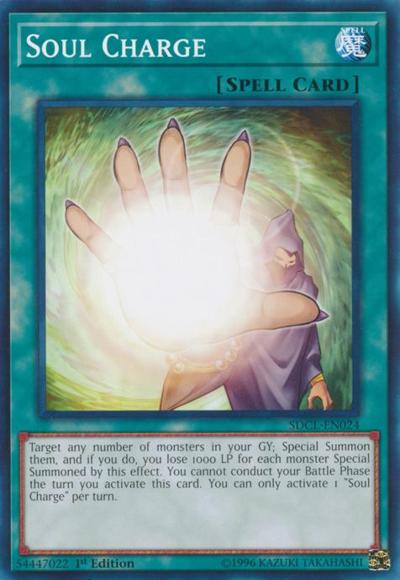 Target any number of monsters in your GY; Special Summon them, and if you do, you lose 1000 LP for each monster Special Summoned by this effect. You cannot conduct your Battle Phase the turn you activate this card. You can only activate 1 ‘Soul Charge’ per turn.