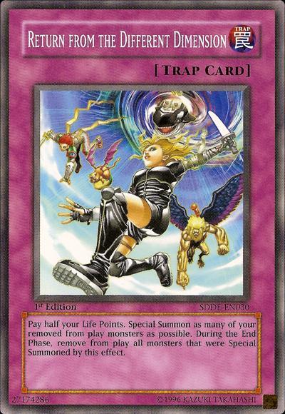 Pay half your Life Points; Special Summon as many of your banished monsters as possible. During the End Phase, banish all monsters that were Special Summoned by this effect.