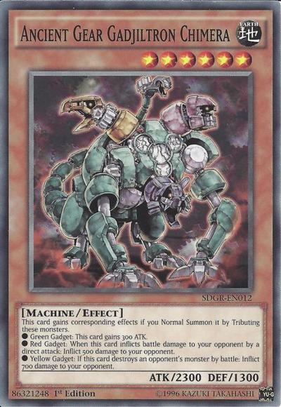 This card gains the appropriate effects if you Normal Summon it by Tributing these monsters.● Green Gadget: This card gains 300 ATK.● Red Gadget: If this card inflicts battle damage to your opponent by a direct attack: Inflict 500 damage to your opponent.● Yellow Gadget: If this card destroys an opponent’s monster by battle: Inflict 700 damage to your opponent.