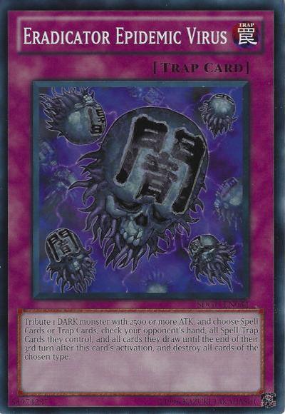 Tribute 1 DARK monster with 2500 or more ATK, and declare 1 type of card (Spell or Trap); look at your opponent’s hand, all Spells/Traps they control, and all cards they draw until the end of their 3rd turn after this card’s activation, and destroy all cards of that declared type.