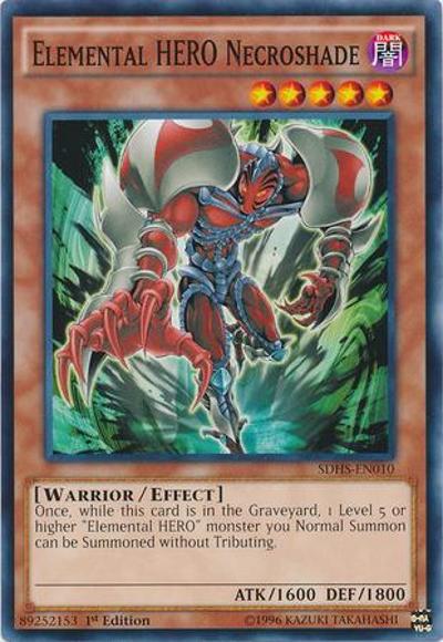 Once, while this card is in the Graveyard, 1 Level 5 or higher ‘Elemental HERO’ monster you Normal Summon can be Summoned without Tributing.