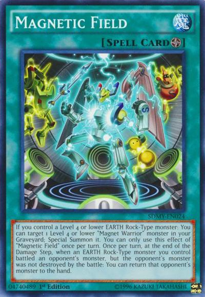 If you control a Level 4 or lower EARTH Rock-Type monster: You can target 1 Level 4 or lower ‘Magnet Warrior’ monster in your Graveyard; Special Summon it. You can only use this effect of ‘Magnetic Field’ once per turn. Once per turn, at the end of the Damage Step, when an EARTH Rock-Type monster you control battled an opponent’s monster, but the opponent’s monster was not destroyed by the battle: You can return that opponent’s monster to the hand.