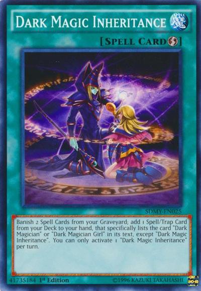 Banish 2 Spells from your GY; add 1 Spell/Trap from your Deck to your hand, that specifically lists the card ‘Dark Magician’ or ‘Dark Magician Girl’ in its text, except ‘Dark Magic Inheritance’. You can only activate 1 ‘Dark Magic Inheritance’ per turn.