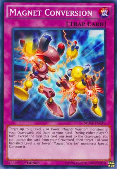 Target up to 3 Level 4 or lower ‘Magnet Warrior’ monsters in your Graveyard; add them to your hand. During either player’s turn, except the turn this card was sent to the Graveyard: You can banish this card from your Graveyard, then target 1 of your banished Level 4 or lower ‘Magnet Warrior’ monsters; Special Summon it.