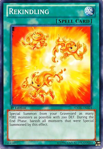 Special Summon from your GY as many FIRE monsters as possible with 200 DEF, but banish them during the End Phase of this turn.