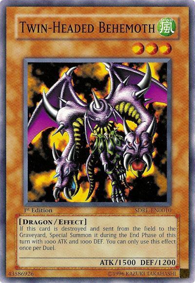 During the End Phase, if this card is in the GY because it was destroyed on the field and sent there this turn: You can Special Summon this card, but its ATK/DEF become 1000. You can only use this effect of ‘Twin-Headed Behemoth’ once per Duel.