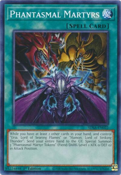Activate only while you have 2 or more cards in your hand, and control a face-up ‘Uria, Lord of Searing Flames’ or ‘Hamon, Lord of Striking Thunder’. Send your entire hand to the Graveyard to Special Summon 3 ‘Phantasmal Martyr Tokens’ (Fiend-Type/DARK/Level 1/ATK 0/DEF 0) in Attack Position.