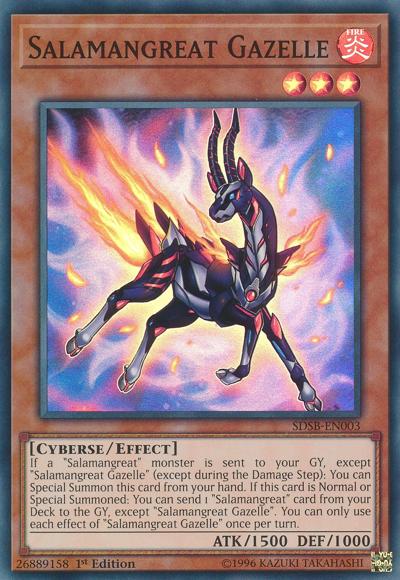 If a ‘Salamangreat’ monster is sent to your GY, except ‘Salamangreat Gazelle’ (except during the Damage Step): You can Special Summon this card from your hand. If this card is Normal or Special Summoned: You can send 1 ‘Salamangreat’ card from your Deck to the GY, except ‘Salamangreat Gazelle’. You can only use each effect of ‘Salamangreat Gazelle’ once per turn.