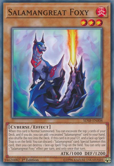 When this card is Normal Summoned: You can excavate the top 3 cards of your Deck, and if you do, you can add 1 excavated ‘Salamangreat’ card to your hand, also shuffle the rest into the Deck. If this card is in your GY, and a face-up Spell/Trap is on the field: You can discard 1 ‘Salamangreat’ card; Special Summon this card, then you can destroy 1 face-up Spell/Trap on the field. You can only use 1 ‘Salamangreat Foxy’ effect per turn, and only once that turn.