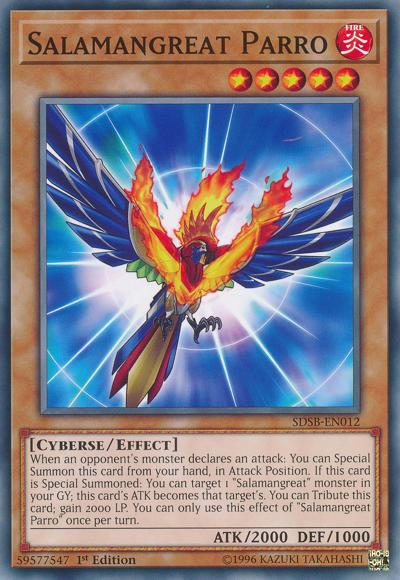 When an opponent’s monster declares an attack: You can Special Summon this card from your hand, in Attack Position. If this card is Special Summoned: You can target 1 ‘Salamangreat’ monster in your GY; this card’s ATK becomes that target’s. You can Tribute this card; gain 2000 LP. You can only use this effect of ‘Salamangreat Parro’ once per turn.