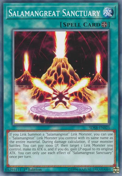 If you Link Summon a ‘Salamangreat’ Link Monster, you can use 1 ‘Salamangreat’ Link Monster you control with its same name as the entire material. During damage calculation, if your monster battles: You can pay 1000 LP, then target 1 Link Monster you control; make its ATK 0, and if you do, gain LP equal to its original ATK. You can only use each effect of ‘Salamangreat Sanctuary’ once per turn.