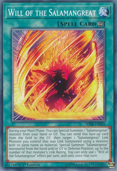 During your Main Phase: You can Special Summon 1 ‘Salamangreat’ monster from your hand or GY. You can send this face-up card from the field to the GY, then target 1 ‘Salamangreat’ Link Monster you control that was Link Summoned using a monster with its same name as material; Special Summon ‘Salamangreat’ monster(s) from your hand and/or GY in Defense Position, up to the number of that monster’s Link Rating. You can only use 1 ‘Will of the Salamangreat’ effect per turn, and only once that turn.