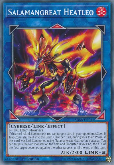 2+ FIRE Effect MonstersIf this card is Link Summoned: You can target 1 card in your opponent’s Spell & Trap Zone; shuffle it into the Deck. Once per turn, during your Main Phase, if this card was Link Summoned using ‘Salamangreat Heatleo’ as material: You can target 1 face-up monster on the field and 1 monster in your GY; the ATK of the first target becomes equal to the other target’s, until the end of this turn.