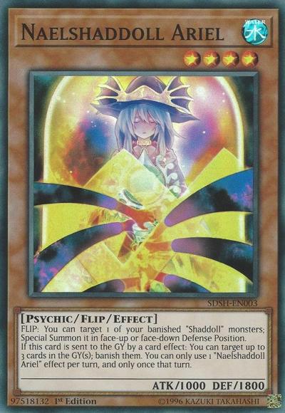FLIP: You can target 1 of your banished ‘Shaddoll’ monsters; Special Summon it in face-up or face-down Defense Position.If this card is sent to the GY by a card effect: You can target up to 3 cards in the GY(s); banish them. You can only use 1 ‘Naelshaddoll Ariel’ effect per turn, and only once that turn.