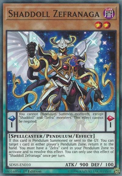 Pendulum EffectYou cannot Pendulum Summon monsters, except ‘Shaddoll’ and ‘Zefra’ monsters. This effect cannot be negated.Monster EffectIf this card is Pendulum Summoned or sent to the Graveyard: You can target 1 card in either player’s Pendulum Zone; return it to the hand. You must have a ‘Zefra’ card in your Pendulum Zone to activate and to resolve this effect. You can only use this effect of ‘Shaddoll Zefranaga’ once per turn.