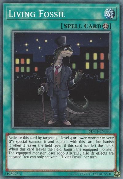 Activate this card by targeting 1 Level 4 or lower monster in your GY; Special Summon it and equip it with this card, but banish it when it leaves the field (even if this card has left the field). When this card leaves the field, banish the equipped monster. The equipped monster loses 1000 ATK/DEF, also its effects are negated. You can only activate 1 ‘Living Fossil’ per turn.