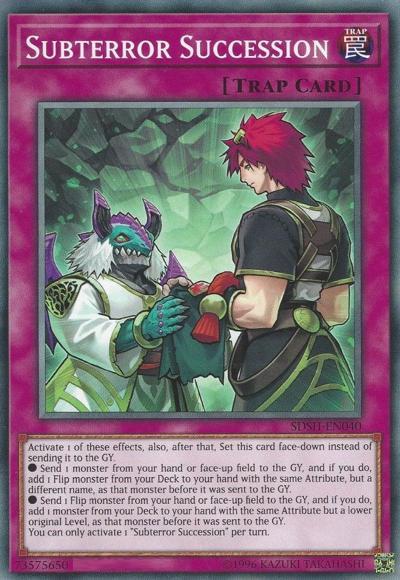 Activate 1 of the these effects, also, after that, Set this card face-down instead of sending it to the GY.● Send 1 monster from your hand or face-up field to the GY, and if you do, add 1 Flip monster from your Deck to your hand with the same Attribute, but a different name, as that monster before it was sent to the GY.● Send 1 Flip monster from your hand or face-up field to the GY, and if you do, add 1 monster from your Deck to your hand with the same Attribute but a lower original Level, as that monster before it was sent to the GY.You can only activate 1 ‘Subterror Succession’ per turn.