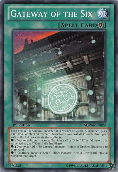 Each time a ‘Six Samurai’ monster(s) is Normal or Special Summoned, place 2 Bushido Counters on this card. You can remove Bushido Counters from your field to activate these effects.● 2 Counters: Target 1 ‘Six Samurai’ or ‘Shien’ Effect Monster; that target gains 500 ATK until the end of this turn.● 4 Counters: Add 1 ‘Six Samurai’ monster from your Deck or GY to your hand.● 6 Counters: Target 1 ‘Shien’ Effect Monster in your GY; Special Summon that target.