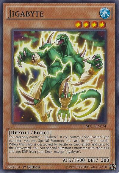 You can only control 1 ‘Jigabyte’. If you control a Spellcaster-Type monster, you can Special Summon this card (from your hand). When this card is destroyed by battle or card effect and sent to the Graveyard: You can Special Summon 1 monster with 1500 ATK and 200 DEF from your Deck, except ‘Jigabyte’.
